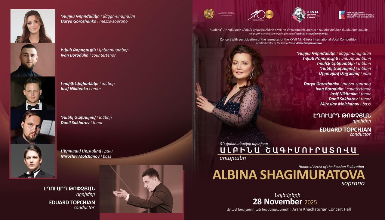 28 ноября 2025 в г. Ереване в Концертном зале им. Арама Хачатуряна состоится концерт лауреатов XXVII Международного конкурса вокалистов имени М.И. Глинки. Выступление в столице Армении – часть беспрецедентного по масштабу турне выдающейся певицы Альбины Шагимуратовой (председателя жюри конкурса) и лауреатов, которое проходит сейчас в разных городах России, а также в Белоруссии, Турции, Казахстане.