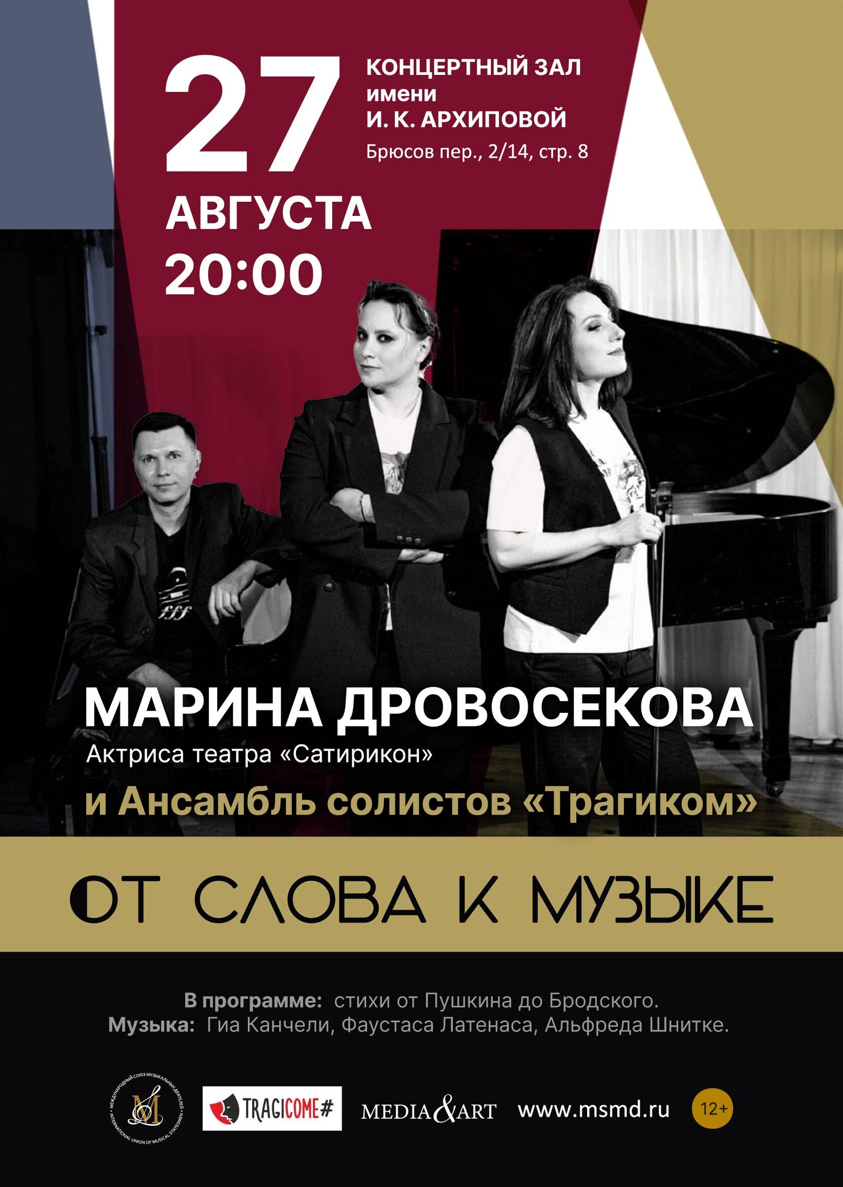 Приглашаем вас на уникальный музыкально-поэтический вечер «От слова к музыке», где талантливая актриса театра «Сатирикон» Марина Дровосекова вместе с ансамблем солистов «Трагиком» подарит незабываемые впечатления!
